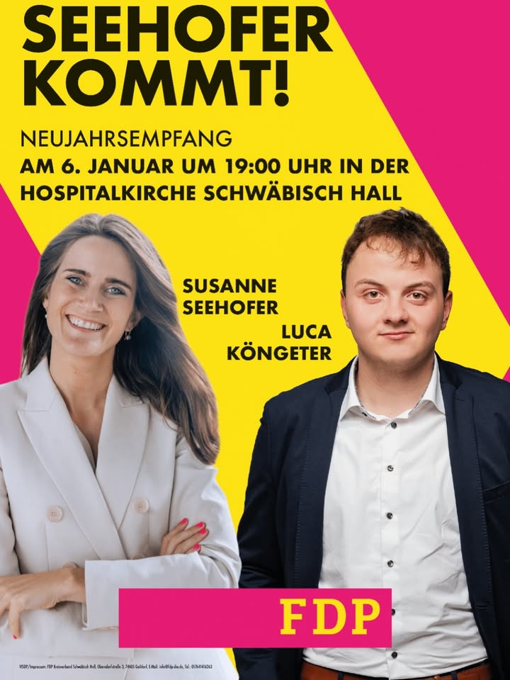 Herzliche Einladung zum Neujahrsempfang am 6. Januar 2026 um 19:00 Uhr in der Hospitalkirche Schwäbisch Hall, Einlass ist ab 18:30 Uhr. ⏰ Gemeinsam mit unserem Landtagskandidaten und Kreisvorsitzenden @lucakoengeter sowie unserer Gastrednerin @susanne.seehofer sprechen wir über liberale Positionen, aktuelle politische Entwicklungen und die Ziele der Freien Demokraten mit Blick auf die Landtagswahl in Baden-Württemberg. Nach den Redebeiträgen laden wir zu einem Sektempfang und zum persönlichen Austausch bei Getränken und Häppchen ein. Mitglieder, Unterstützer, Interessierte und Gäste sind herzlich willkommen. Lasst uns gemeinsam Motivation und Rückenwind für den Wahlkampf sammeln. #Neujahrsempfang #FDP #LandtagswahlBW